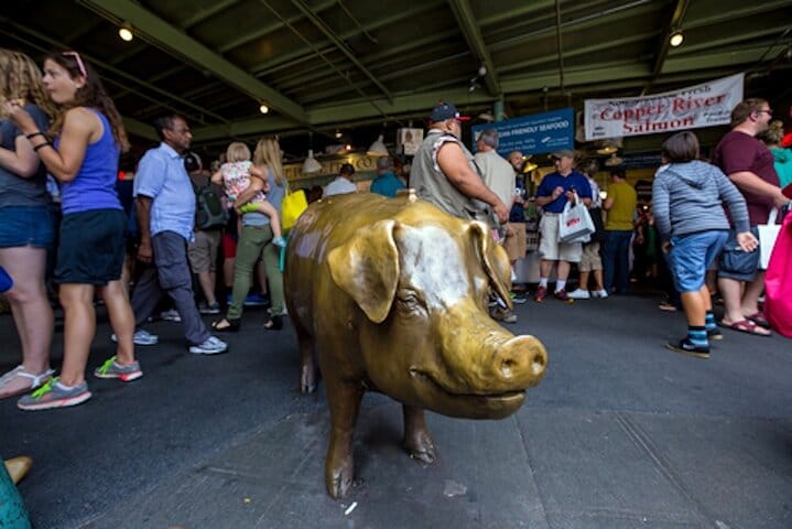 Oldest Starbucks? Gum Wall? Original Skid Roe? Pioneer Square? What's the deal with the purple glass? Discover the story of Seattle, it's history, it's people, it's story. Go at your own pace, anytime. Our tour will take you through the bustling Pike Place Market where fishmongers still throw salmon through the air, wind down the steep streets where Seattle's downtown meets Elliott Bay, pass the exact spot where the Great Fire of 1889 started from an overturned glue pot, and end at the magnificent King Street Station where gold prospectors once arrived with dreams of striking it rich. You will hear stories about how Seattle literally raised itself up by one story after the devastating fire, and discover why one street was called Skid Road long before it became a term for down-and-out neighborhoods.